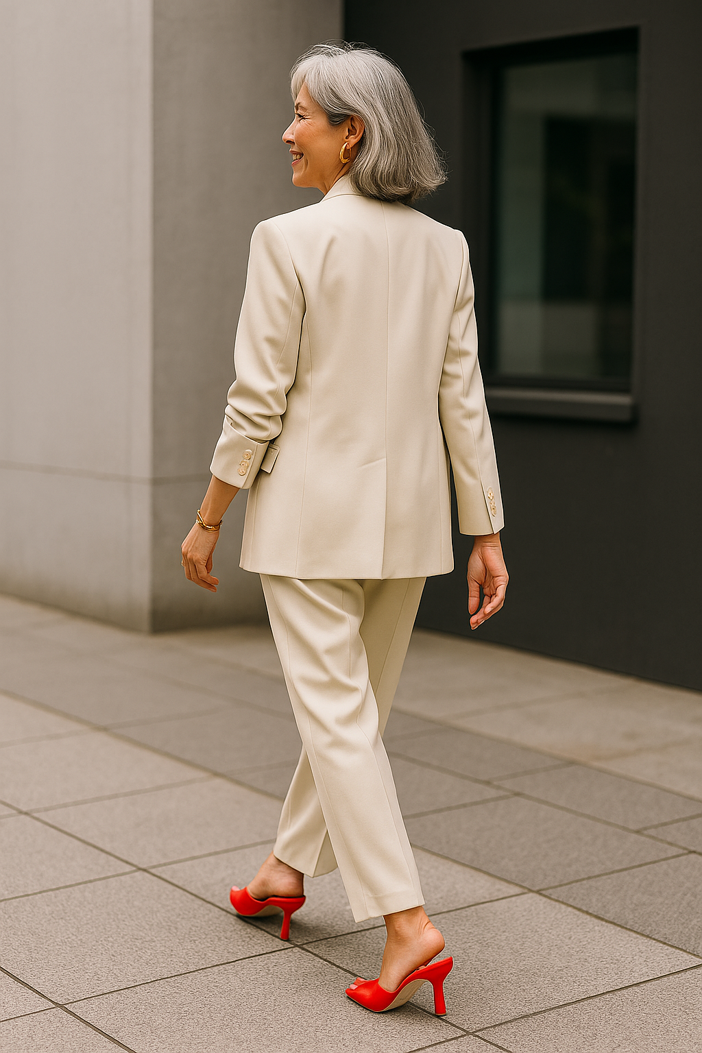 베이지 또는 부드러운 크림 톤의 셋업 정장은 그 자체만으로도 **‘고급스러움’과 ‘세련됨’**을 동시에 표현할 수 있는 강력한 아이템입니다.