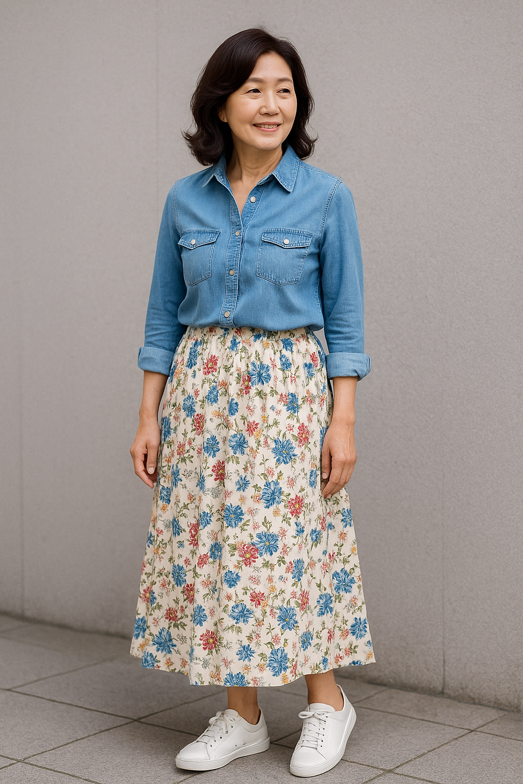 3. 편안함 속의 스타일, 캐주얼한 데님 셔츠 + 롱스커트