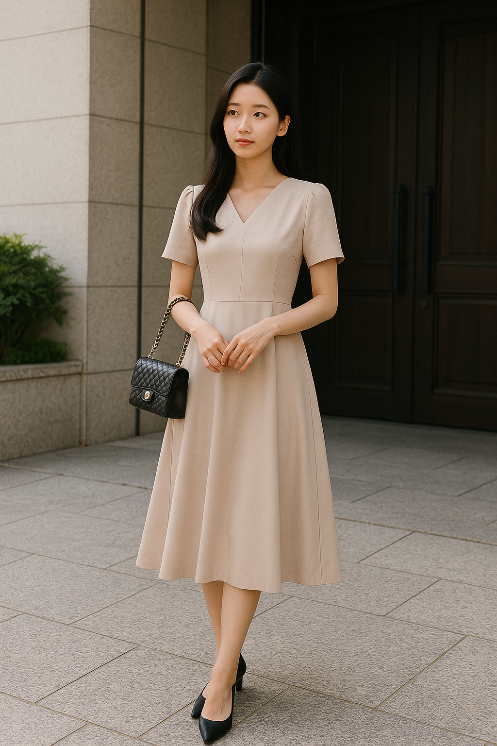 호텔 결혼식은 격식을 갖춘 미디 드레스나 블라우스+슬랙스 조합이 적합합니다.