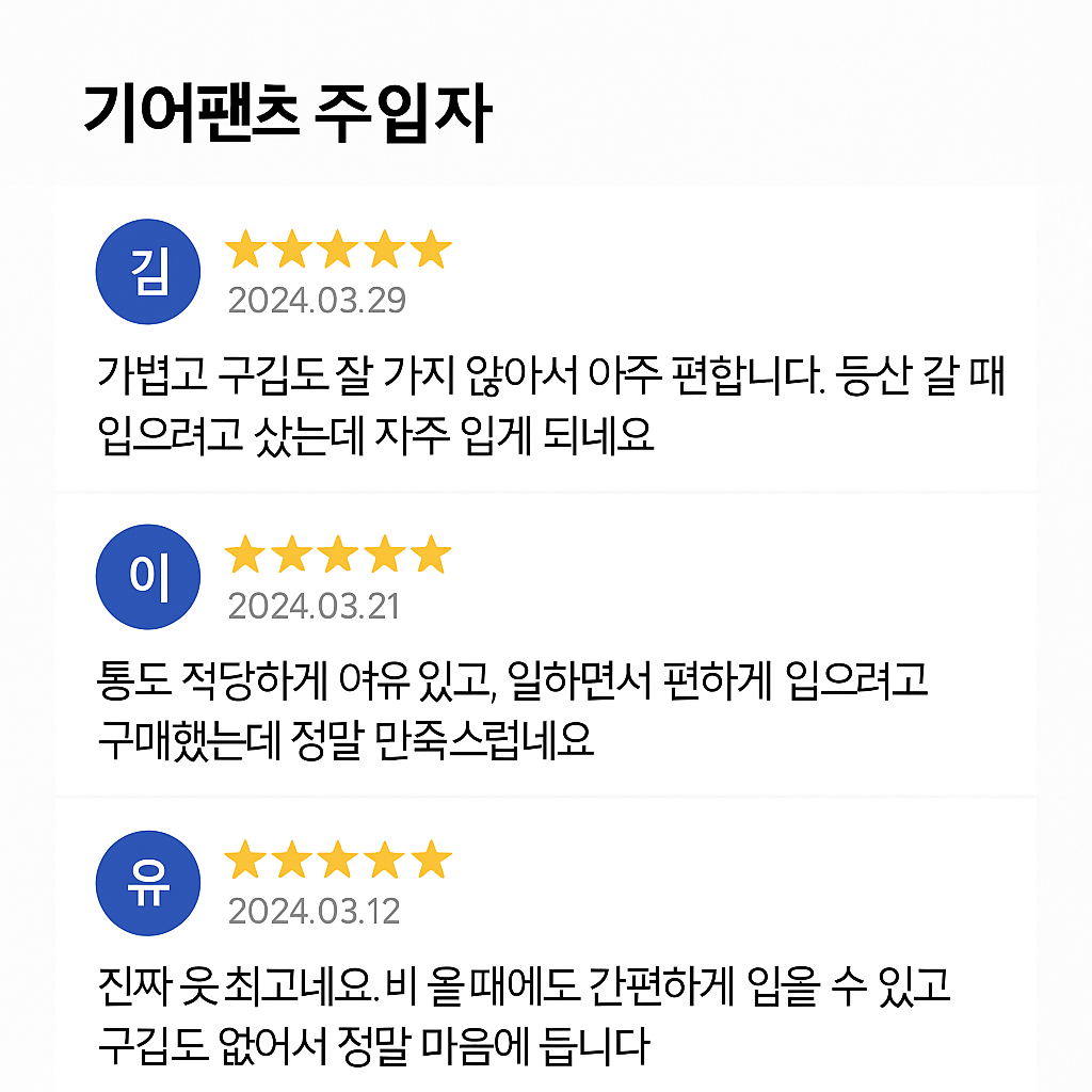 특히 여름엔 땀이 나도 들러붙지 않고, 비 오는 날에는 생활 방수가 잘 되어 만족스러웠다.