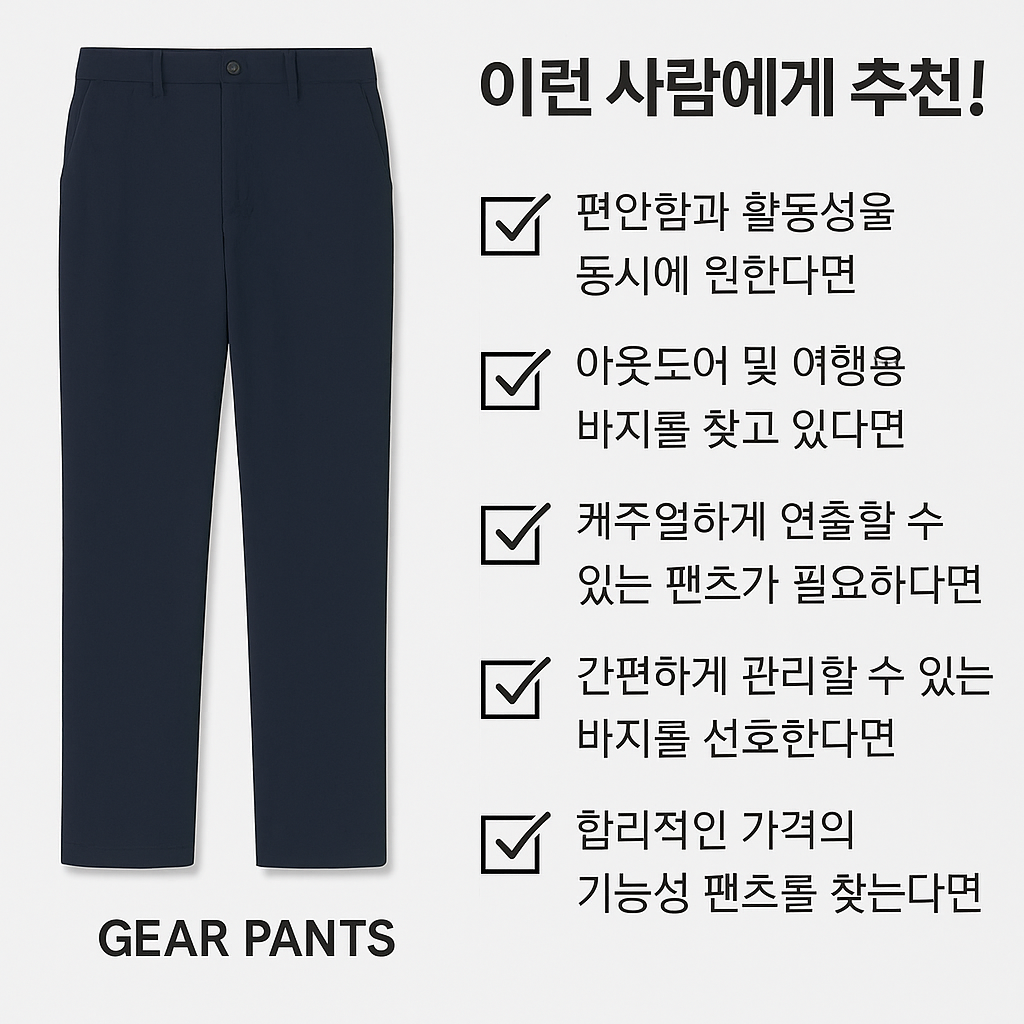 요즘 바지 하나 사려고 검색하면 진짜 수많은 선택지가 쏟아진다. 트레이닝, 조거, 슬랙스, 워크웨어, 기능성까지. 그중에서도 유니클로의 기어팬츠는 좀 특별한 느낌이 있다.