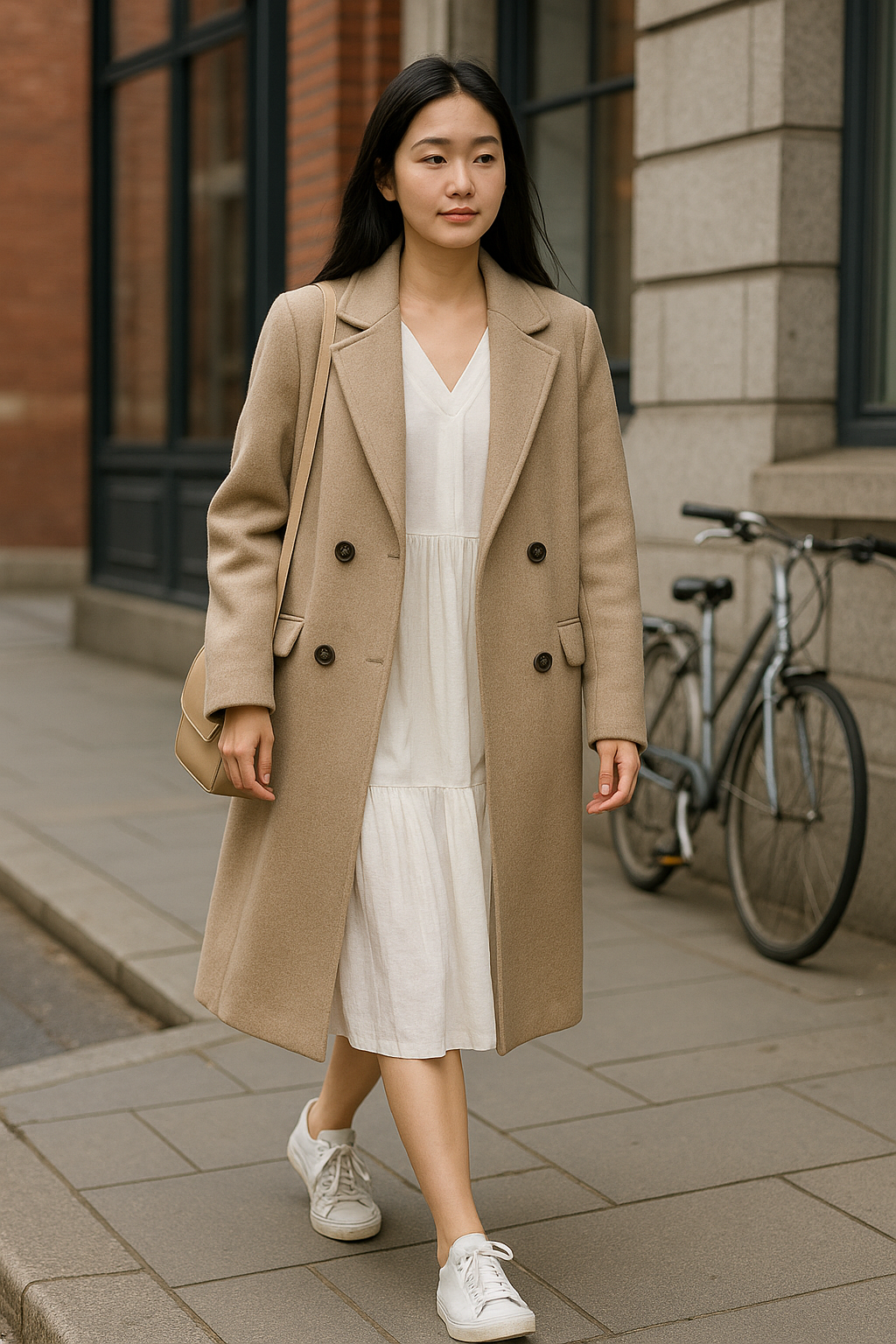 초여름의 맑고 간결한 날씨 속에서, 차분한 모직 코트는 의외로 세련된 분위기를 연출합니다. 이는 단순한 온도 조절 이상의 효과를 지니며, 미니멀하면서도 구조적인 룩을 완성시키는 데 큰 역할을 합니다.