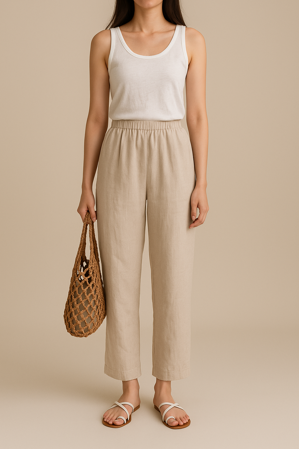 화이트 슬리브리스 + 린넨 팬츠 + 미니 네트백 베이지로 감성적인 한 끗 포인트 완성.