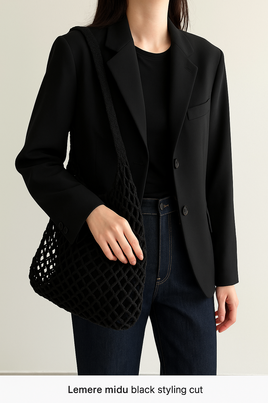 블랙 재킷 + 생지 데님 + 미듐 블랙 네트백으로 도시적인 미니멀룩 연출.