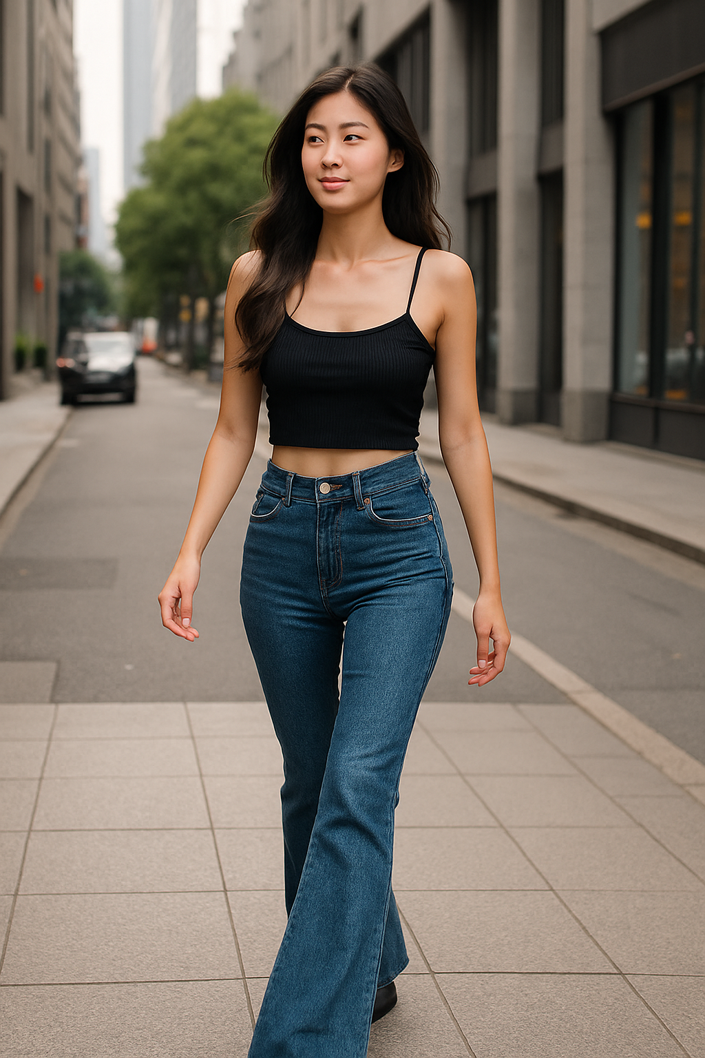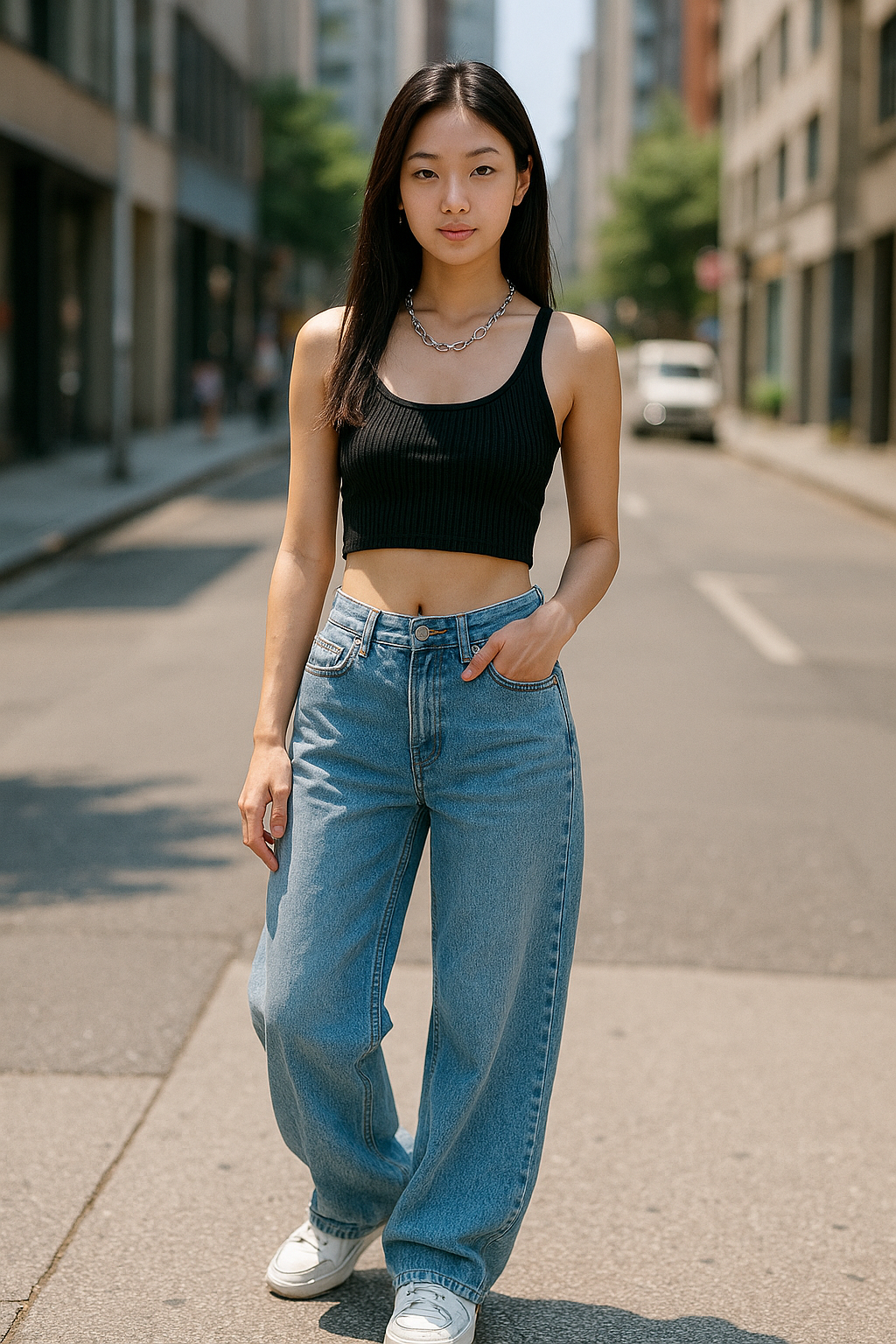 - 상체는 짧고, 하체는 길게 – 크롭트 탑과 와이드 팬츠 조합