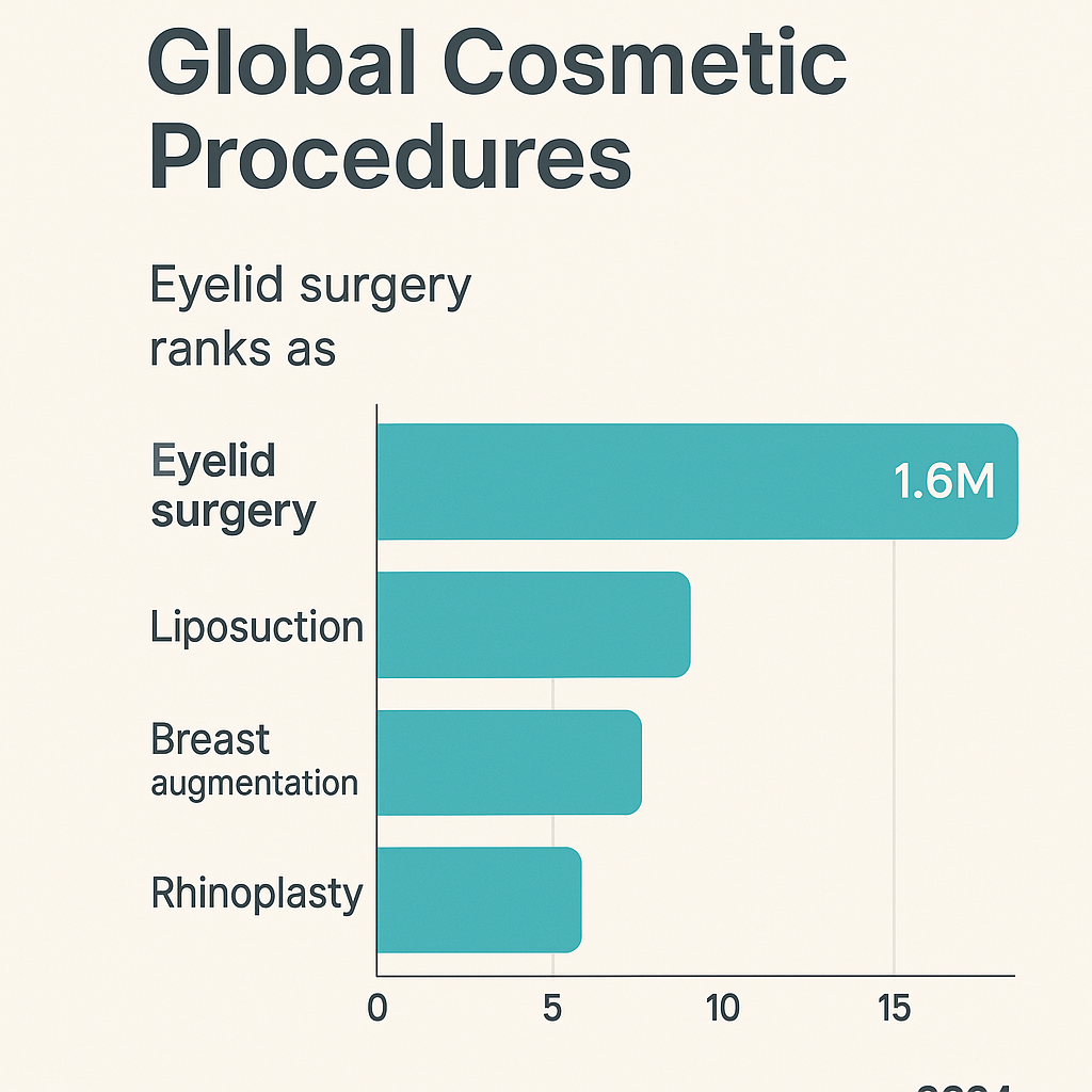 ISAPS가 집계한 전 세계 미용 성형 시술 통계에 따르면, 2024년 기준 눈꺼풀 수술(blepharoplasty)은 약 1,620만 건으로 전체 시술 중 가장 높은 비율을 차지했습니다.