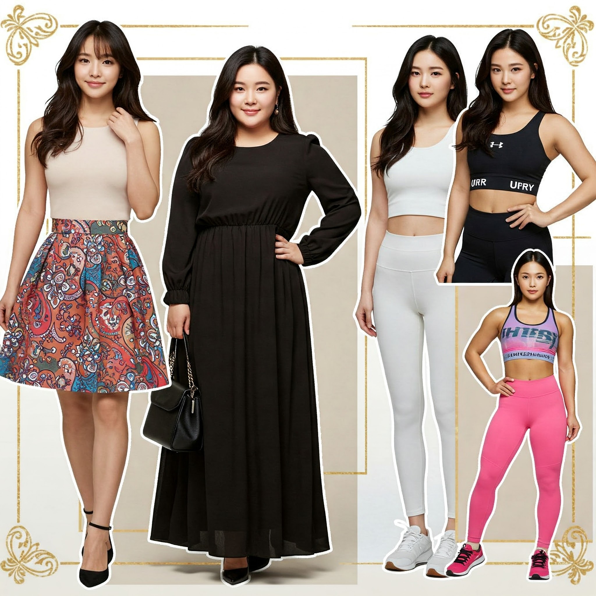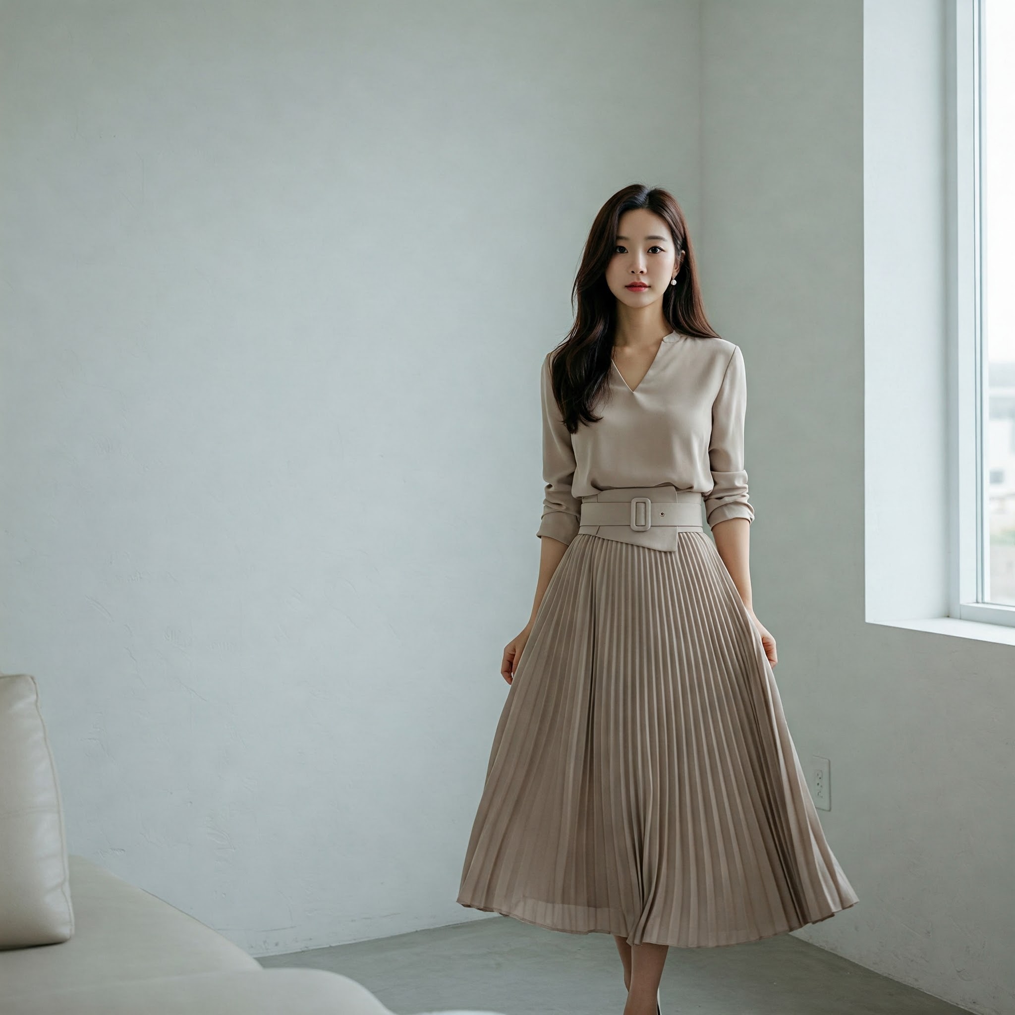 - 하의: 플리츠 스커트나 볼륨감 있는 팬츠로 곡선 만들기