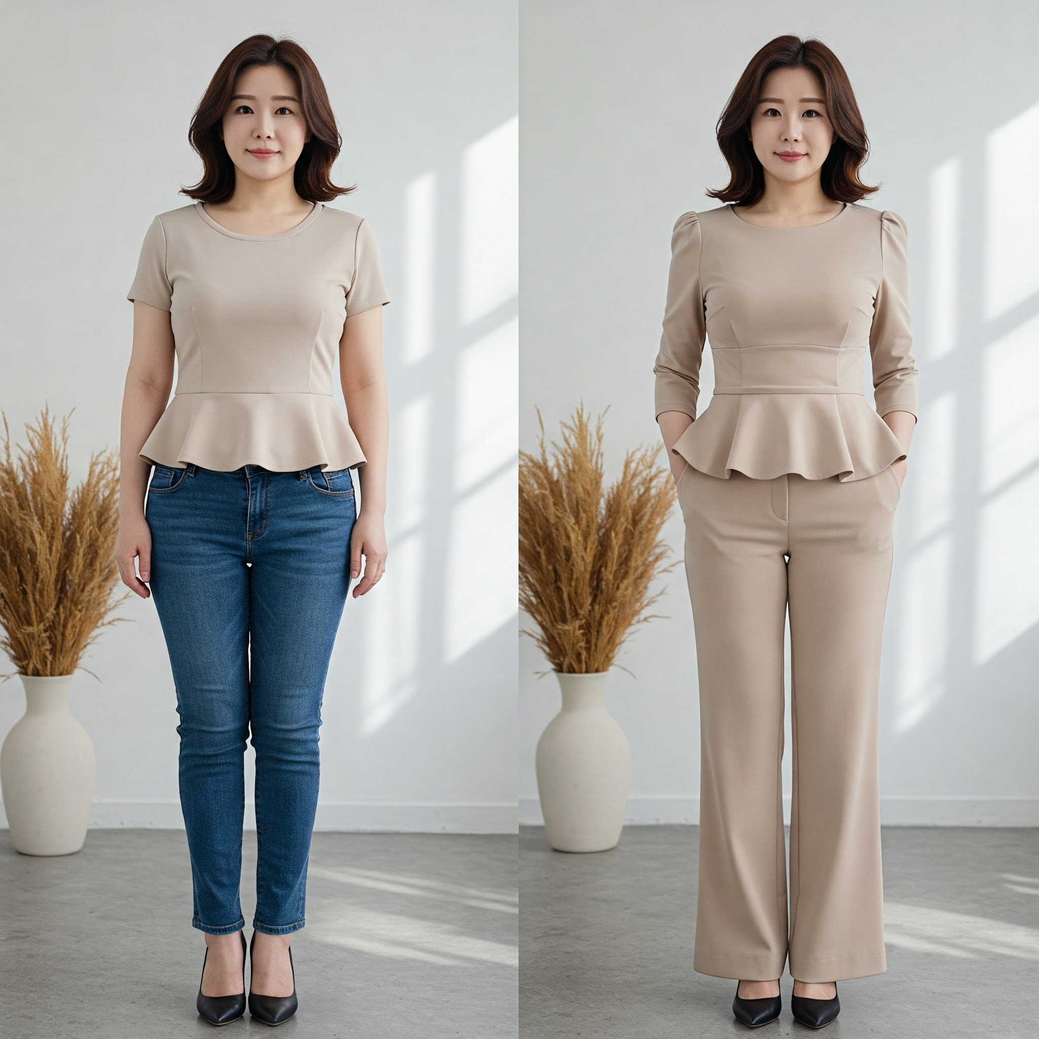 - 상의: 허리 라인이 들어간 페플럼 탑이나 랩 스타일 블라우스