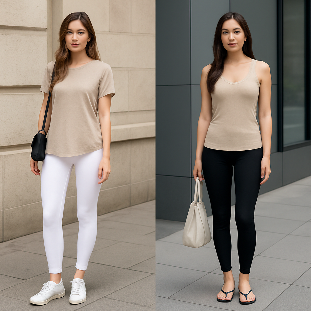 레깅스를 캐주얼하게 입는 건 좋지만, 전체 코디가 운동복 느낌으로만 흘러가면 데일리룩으론 어색해질 수 있어요. 캐주얼한 느낌엔 스니커즈, 미니멀한 룩엔 샌들, 시크한 무드엔 슬리퍼나 뮬 등을 고려해 균형을 맞춰야 합니다.