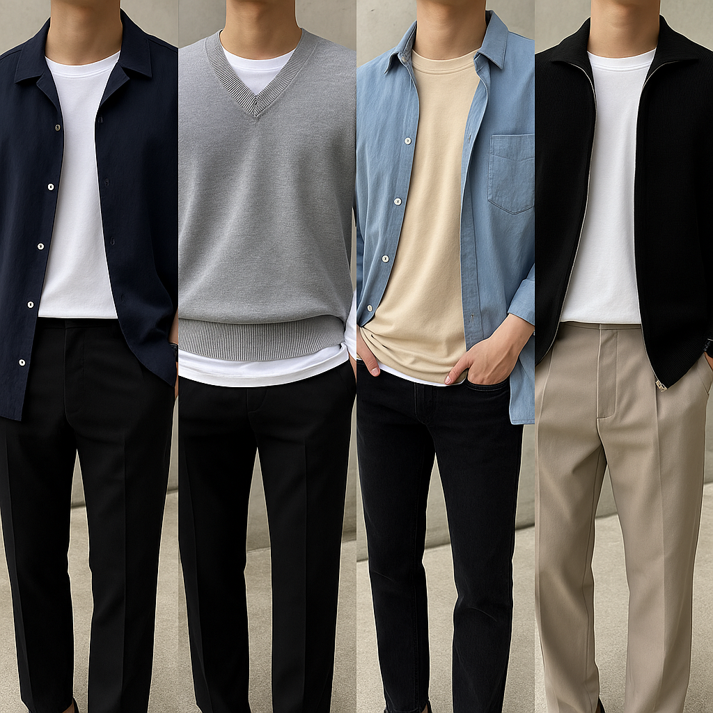 남성 탑은 단독으로도 좋지만, 레이어드 하면 스타일의 깊이가 더해집니다. 반팔티 위에 버튼 업을 걸치거나, 니트 베스트와 매치하면 센스가 살아납니다.