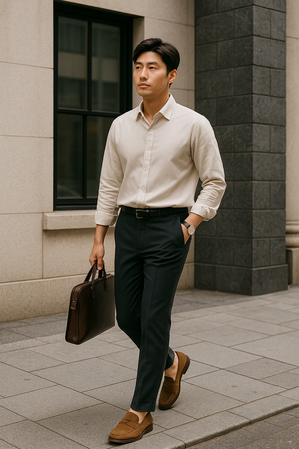 코디 팁: 린넨 셔츠와 슬랙스에 스웨이드 로퍼를 매치하면 가볍고 세련된 포멀룩이 완성됩니다.