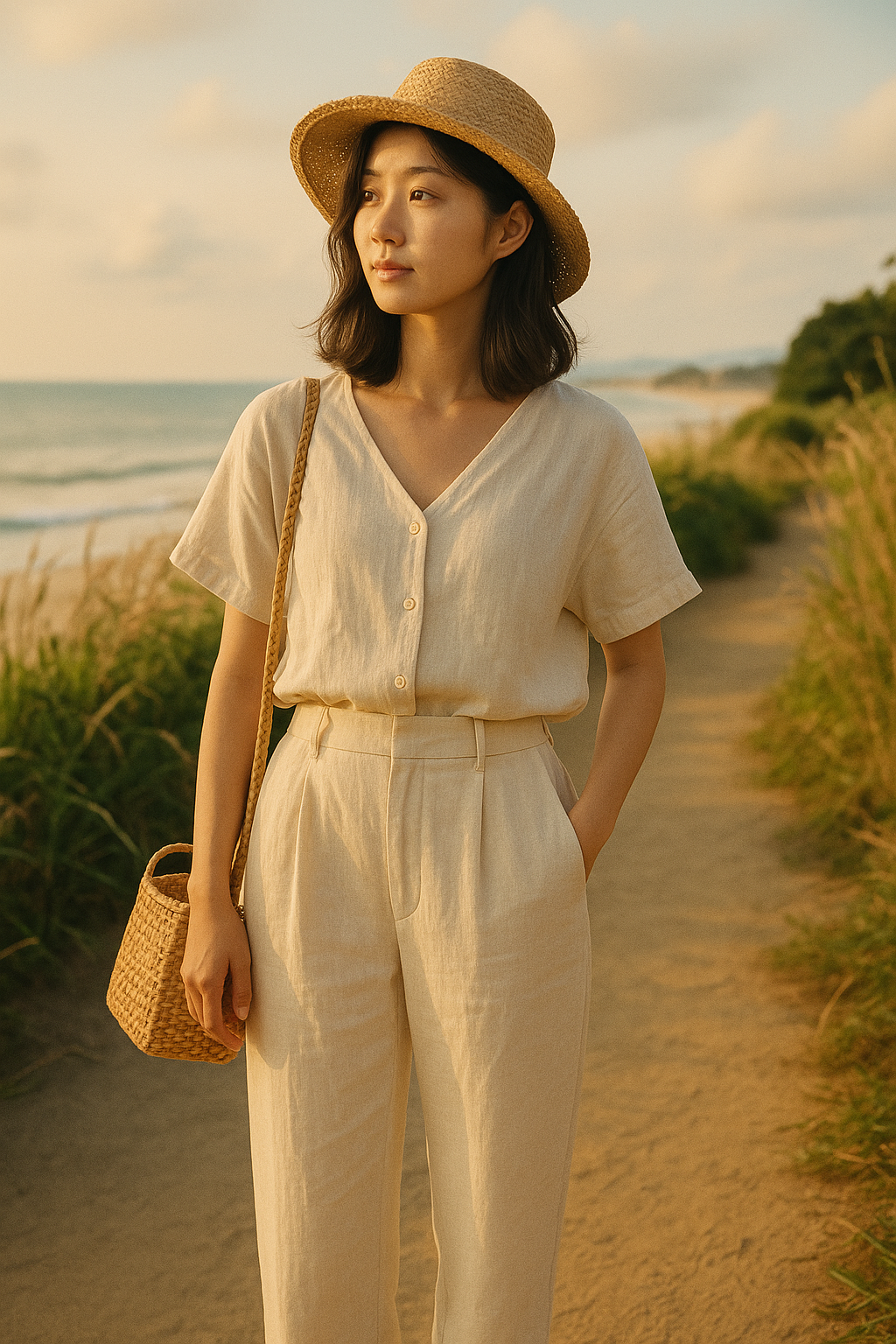 라탄백과 밀짚모자를 더하면 여름 여행지에서도 완성도 높은 감성룩이 됩니다.