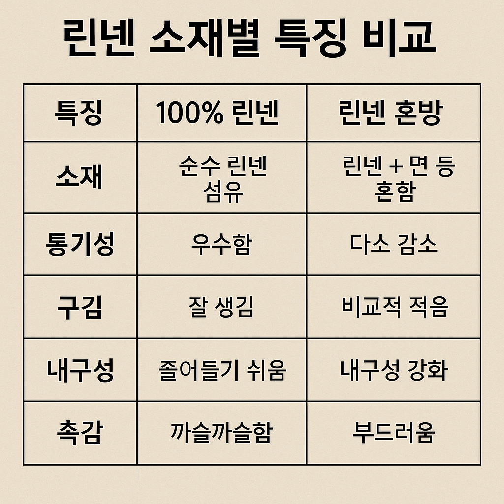 100% 린넨은 통기성은 뛰어나지만 구김이 많기 때문에 레이온이나 코튼이 혼합된 제품이 실용성에서 유리하죠.